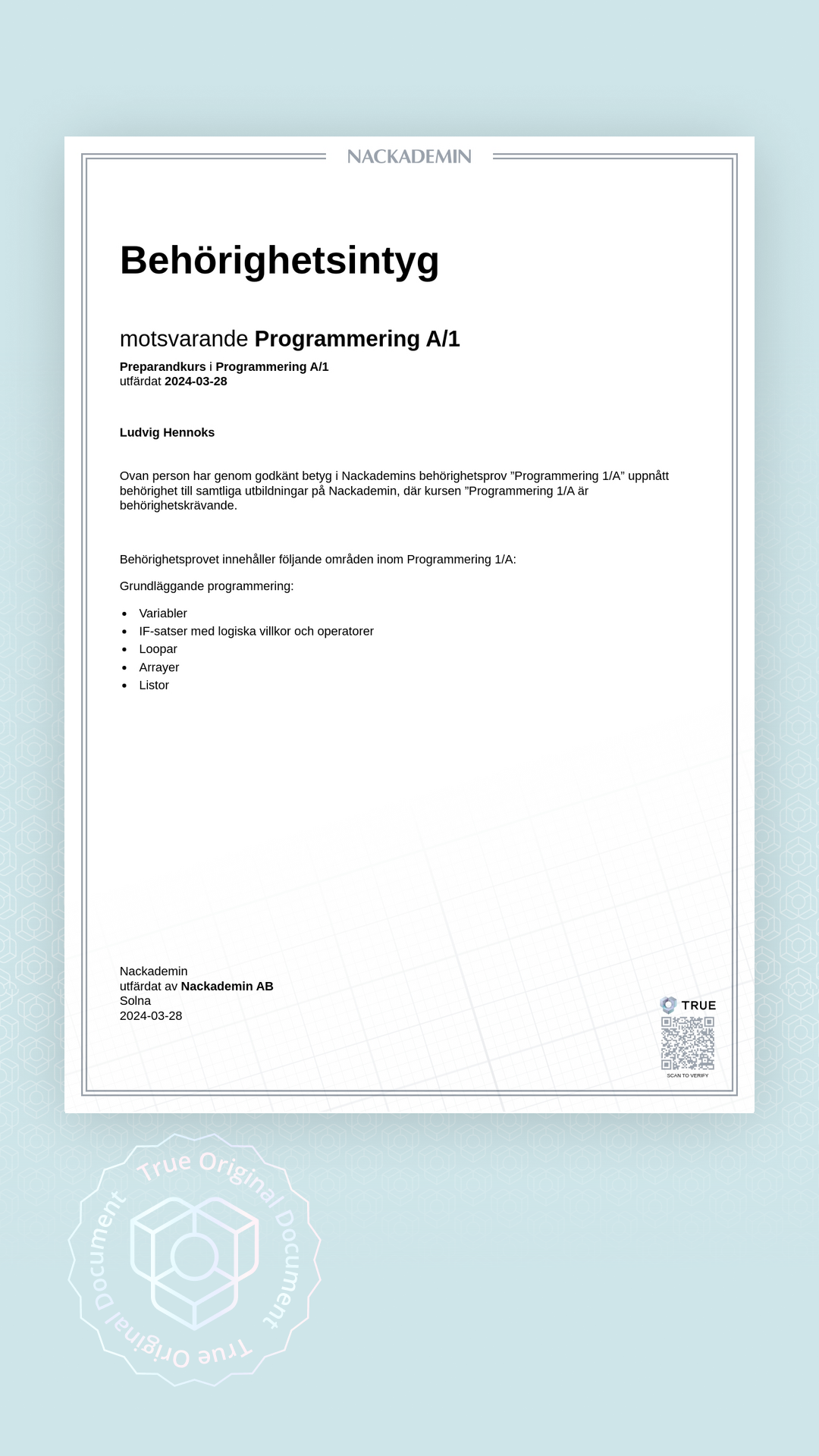 Alla TRUE -document är säkrade med blockchain-teknologi och kan verifieras som äkta. Klicka på verifieringsknappen bredvid dokumentet eller skanna QR-koden med din smartphones kamera. Ingen app krävs - dokumentets äkthet verifieras omedelbart.