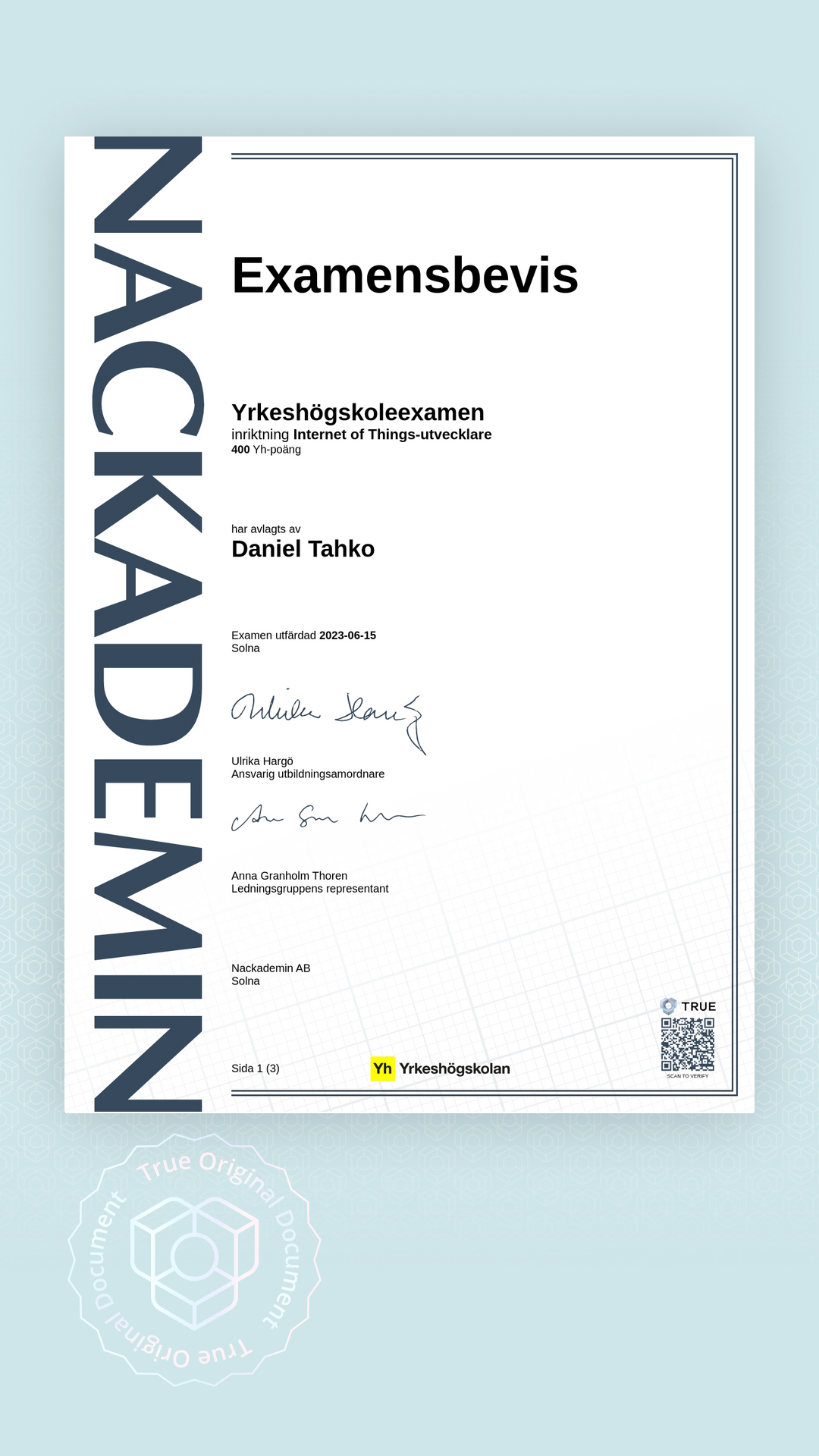 Alla TRUE -document är säkrade med blockchain-teknologi och kan verifieras som äkta. Klicka på verifieringsknappen bredvid dokumentet eller skanna QR-koden med din smartphones kamera. Ingen app krävs - dokumentets äkthet verifieras omedelbart.