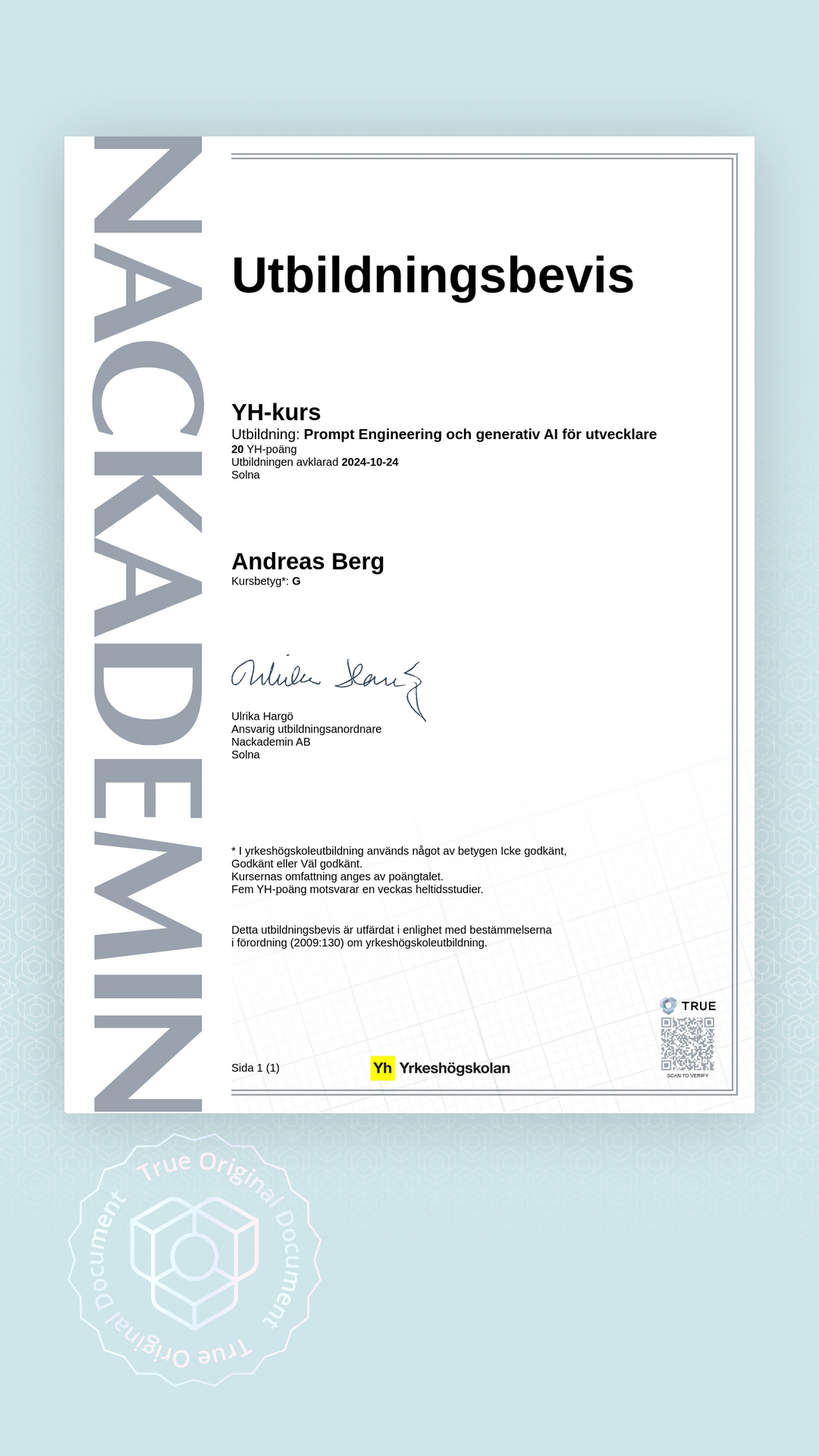 Alla TRUE -document är säkrade med blockchain-teknologi och kan verifieras som äkta. Klicka på verifieringsknappen bredvid dokumentet eller skanna QR-koden med din smartphones kamera. Ingen app krävs - dokumentets äkthet verifieras omedelbart.